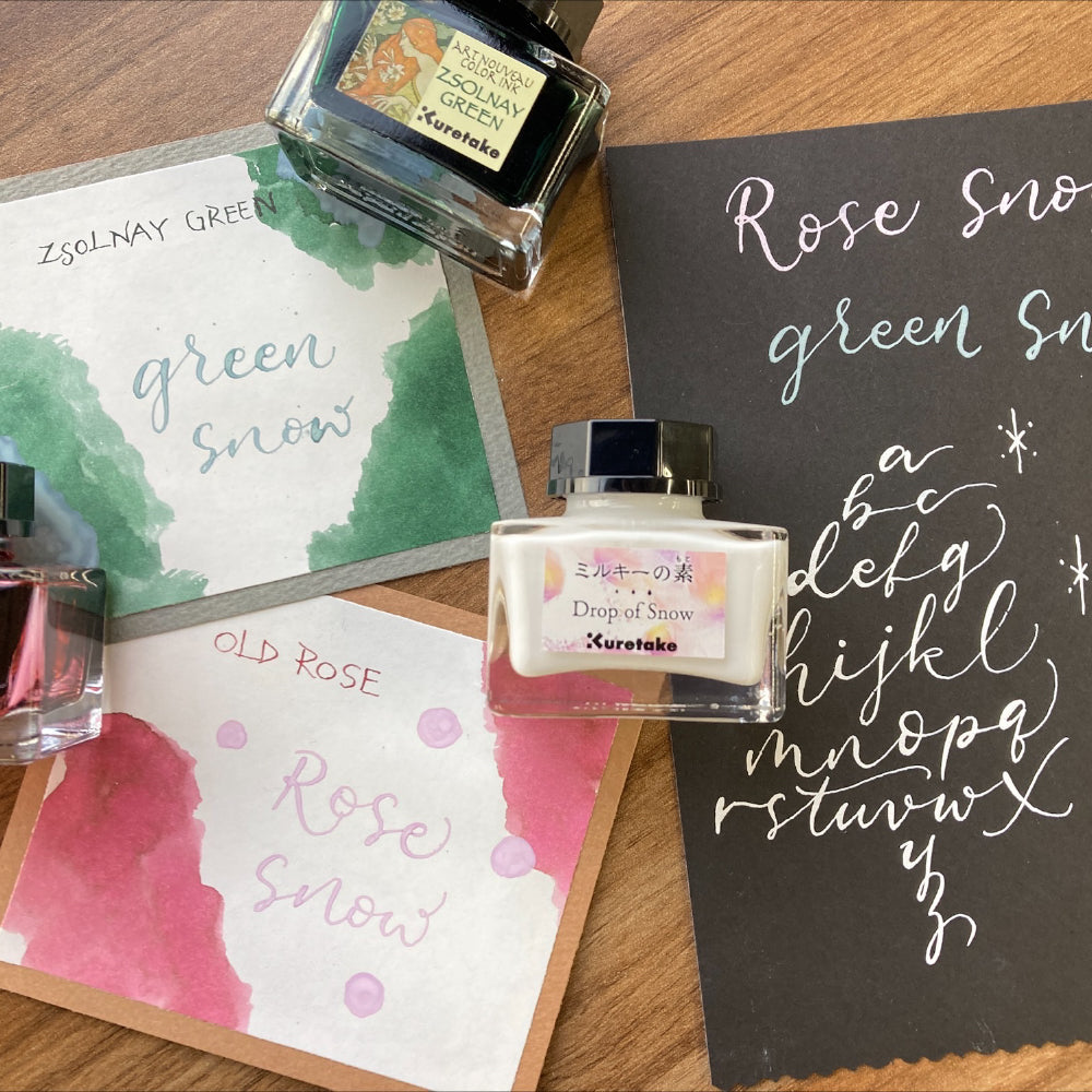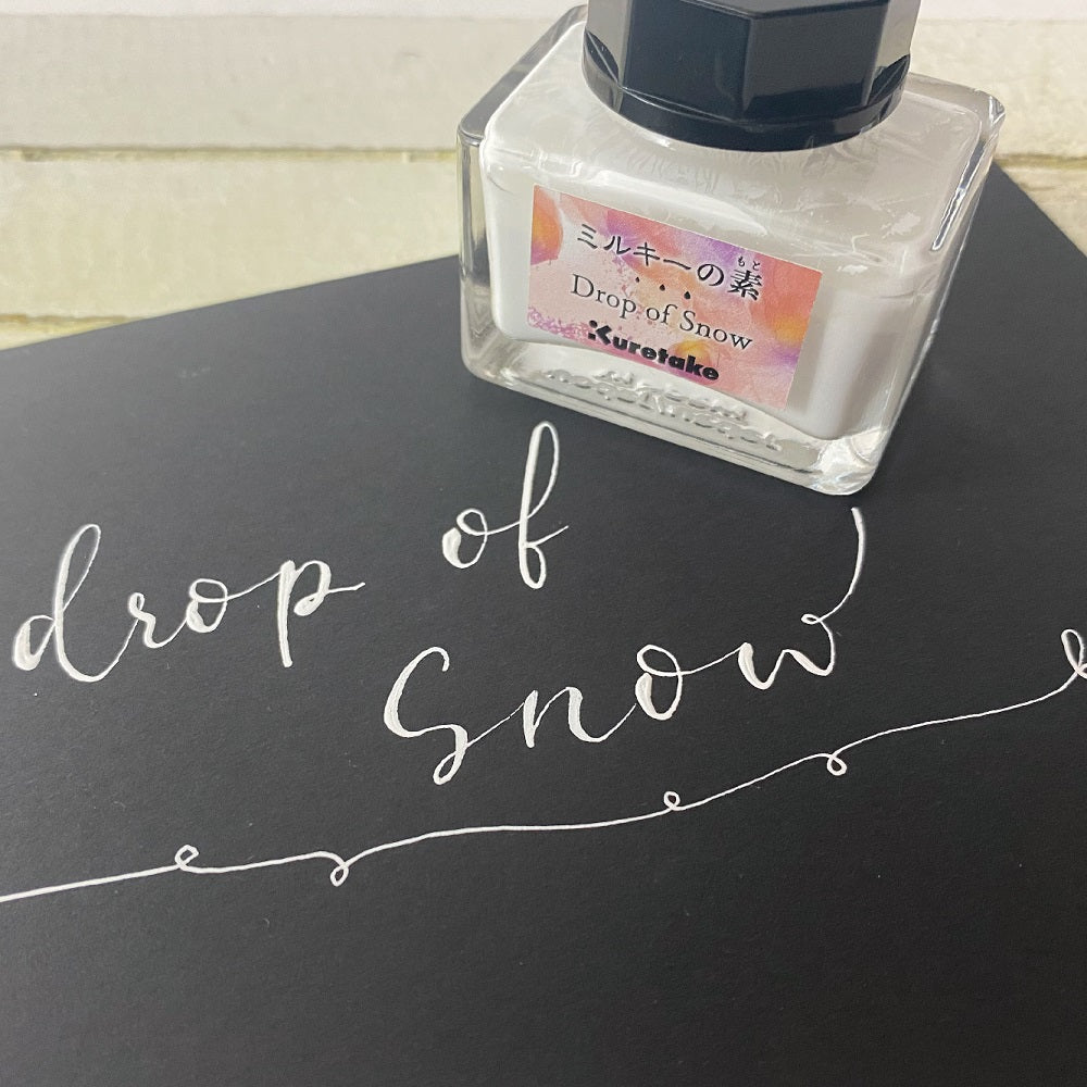 そのままでホワイトインクとして使ったり、黒や濃い色の紙にも使用できます。ガラスペン・つけペン・筆などでお楽しみください。